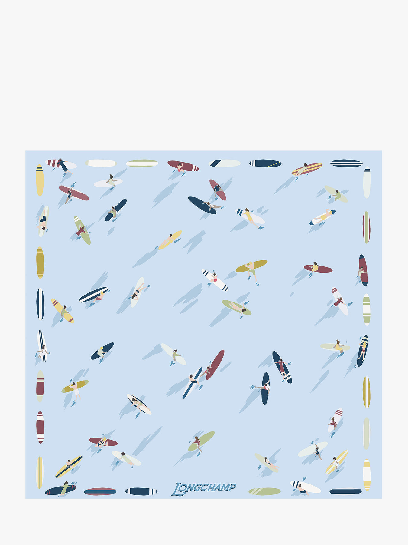 Le carré de soie 50 En Attendant la Vague LONGCHAMP, composé de soie luxueuse, invite à quitter l’agitation urbaine pour se fondre dans l’écume des vagues. Cet imprimé coloré dévoile des planches multicolores et des silhouettes assises, capturant les corps en attente, tentant de se hisser pour attraper leur toute première vague avec patience et ardeur. Plus qu’un sport, le surf ici se révèle comme une véritable culture et un art de vivre, célébré à travers ce motif poétique et vibrant. Ce carré de soie incarne l’essence d’un été mêlant contemplation et passion, offrant une touche d’élégance et de liberté à votre style.