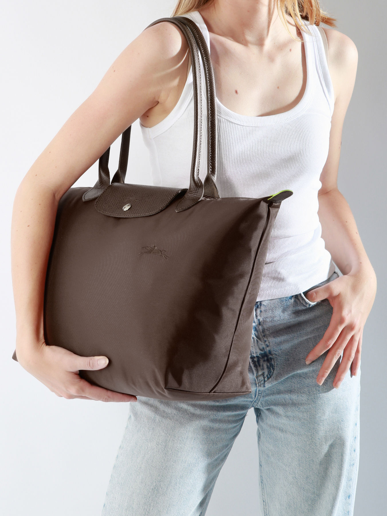 Mesdames, découvrez la version large du sac à main Le Pliage Green signé Longchamp. Ce sac à main aux vertus écologiques est doté d'une allure aussi tendance que la version originale. Vous allez donc adorer retrouver sa forme emblématique, le logo Longchamp sur le devant et le petit rabat à pression. Pour vous accompagner lors de vos après-midi shopping entre copines, ce sac à main sera parfait. Son espace de rangement est spacieux et vous permet d'y glisser des documents A4. Ce sac à main Le Pliage Green de chez Longchamp est donc une pièce à surtout ajouter à sa garde-robe. Son style intemporel pourra s'accorder à toutes vos tenues. Grâce à ses deux grandes anses de 21 cm, vous pourrez choisir de porter ce sac à main femme à la main ou sur l'épaule.