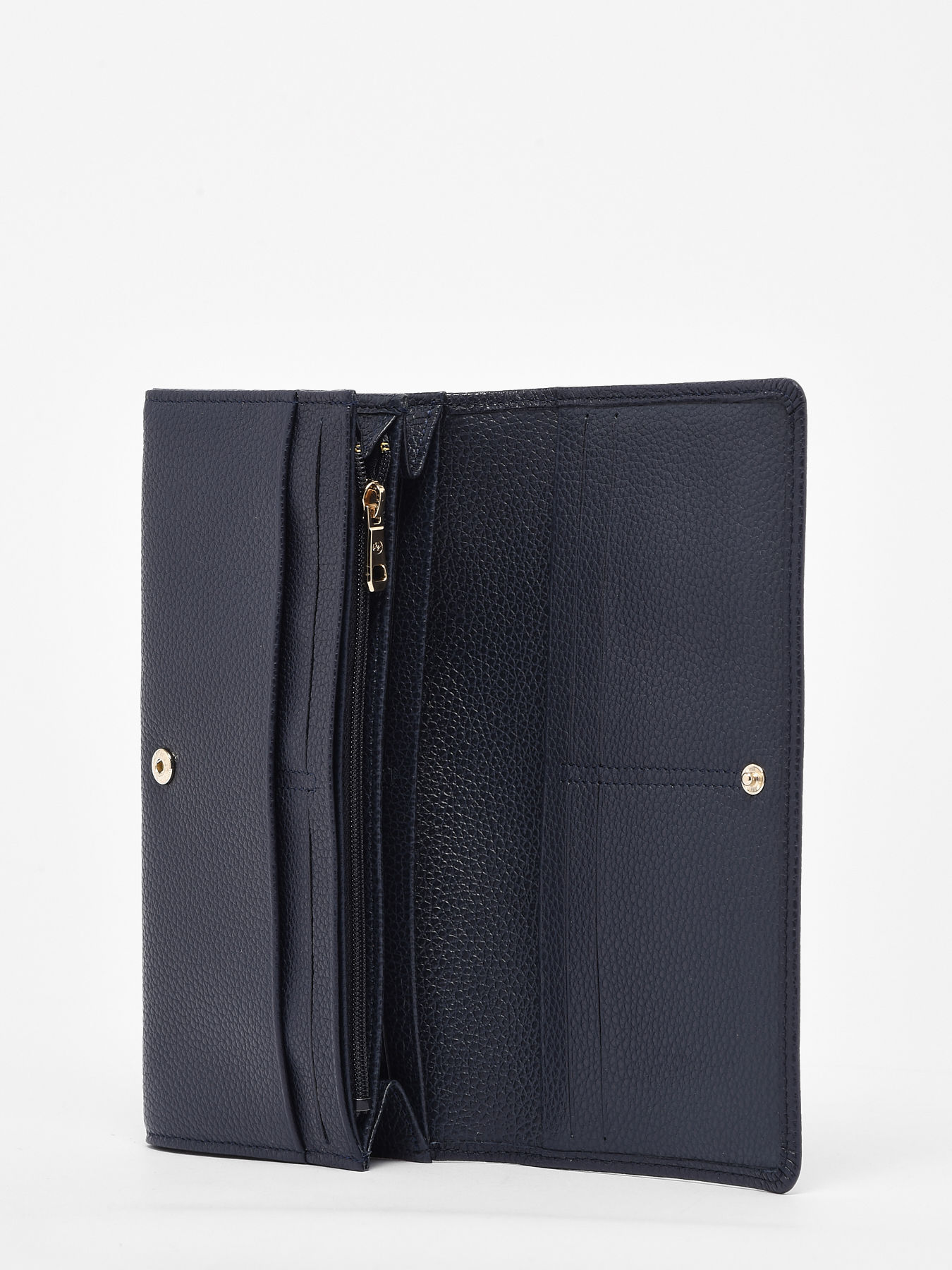 Sous le rabat à pression, vous trouverez douze emplacements pour cartes, trois poches simples pour ranger vos papiers d'identité, une poche pour vos billets et une poche zippée pour mettre vos pièces.