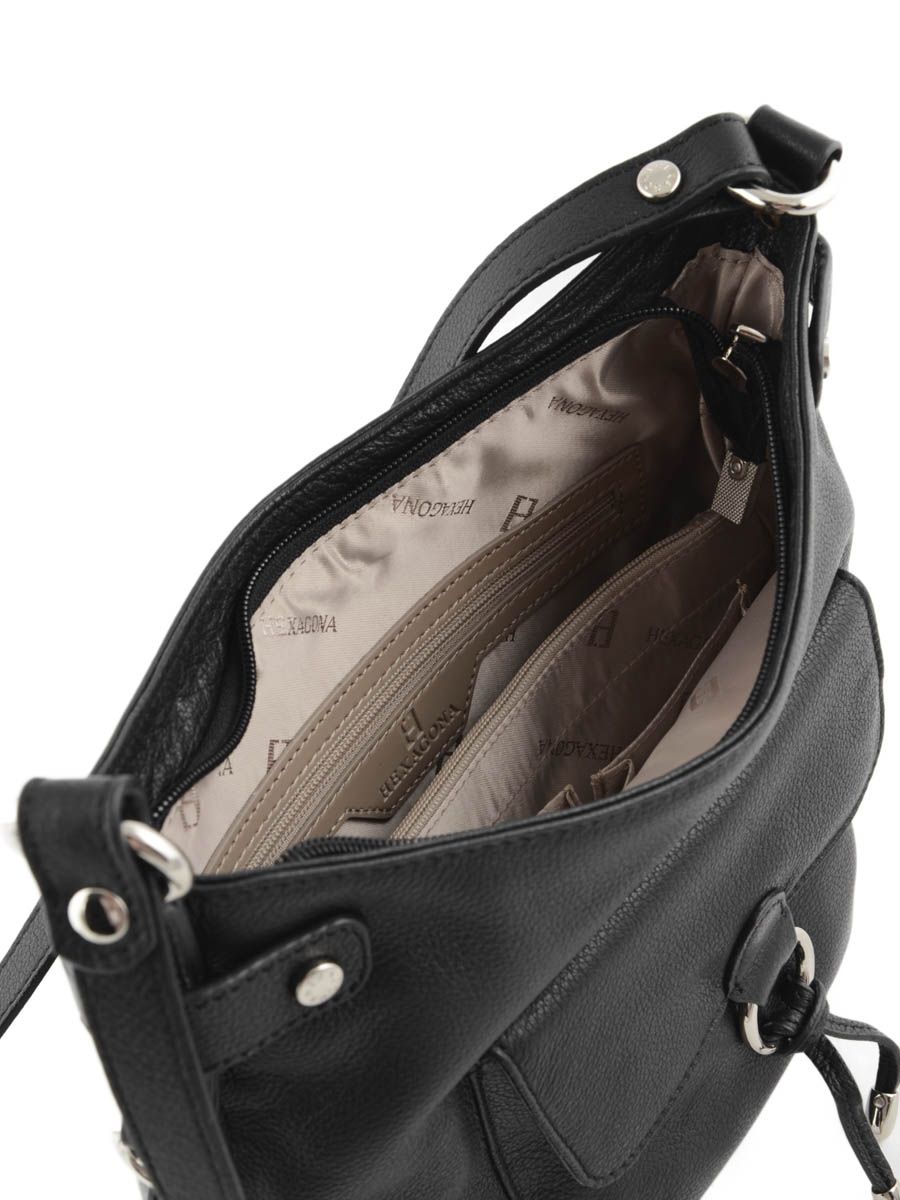 Sac en bandoulière de chez Hexagona, très élégant, en véritable cuir de vachette. Son cuir, légèrement grainé, est souple et doux au toucher. Ce modèle de la ligne Pretty se porte soit croisé soit long sous le bras, grâce à sa bandoulière réglable. Il possède une poche à rabat sur le devant, joliment décorée d'un anneau et d'une lanière en cuir. A l'intérieur, le compartiment est divisé en deux par une poche zippée et on retrouve d'autres poches, très pratiques.