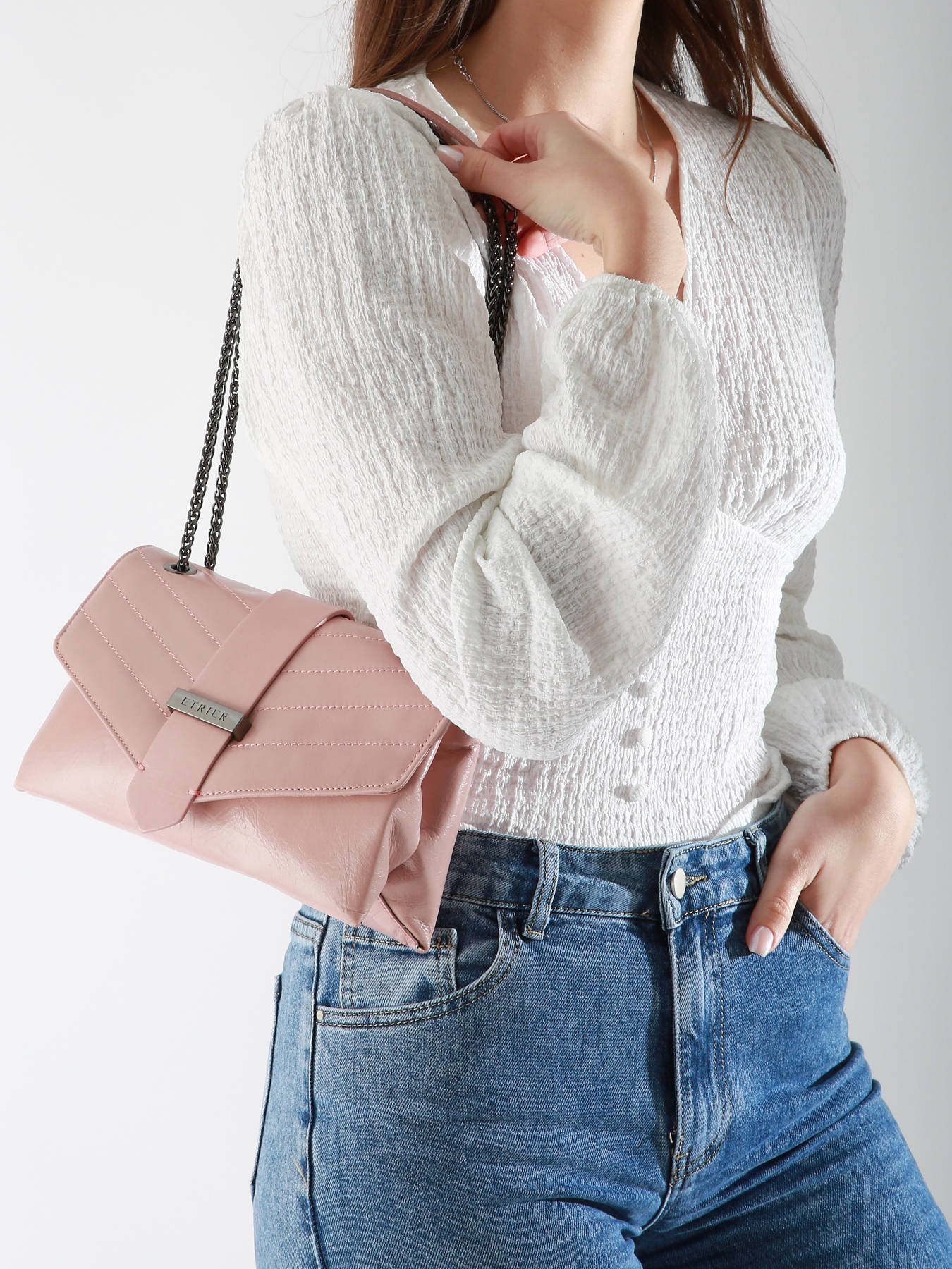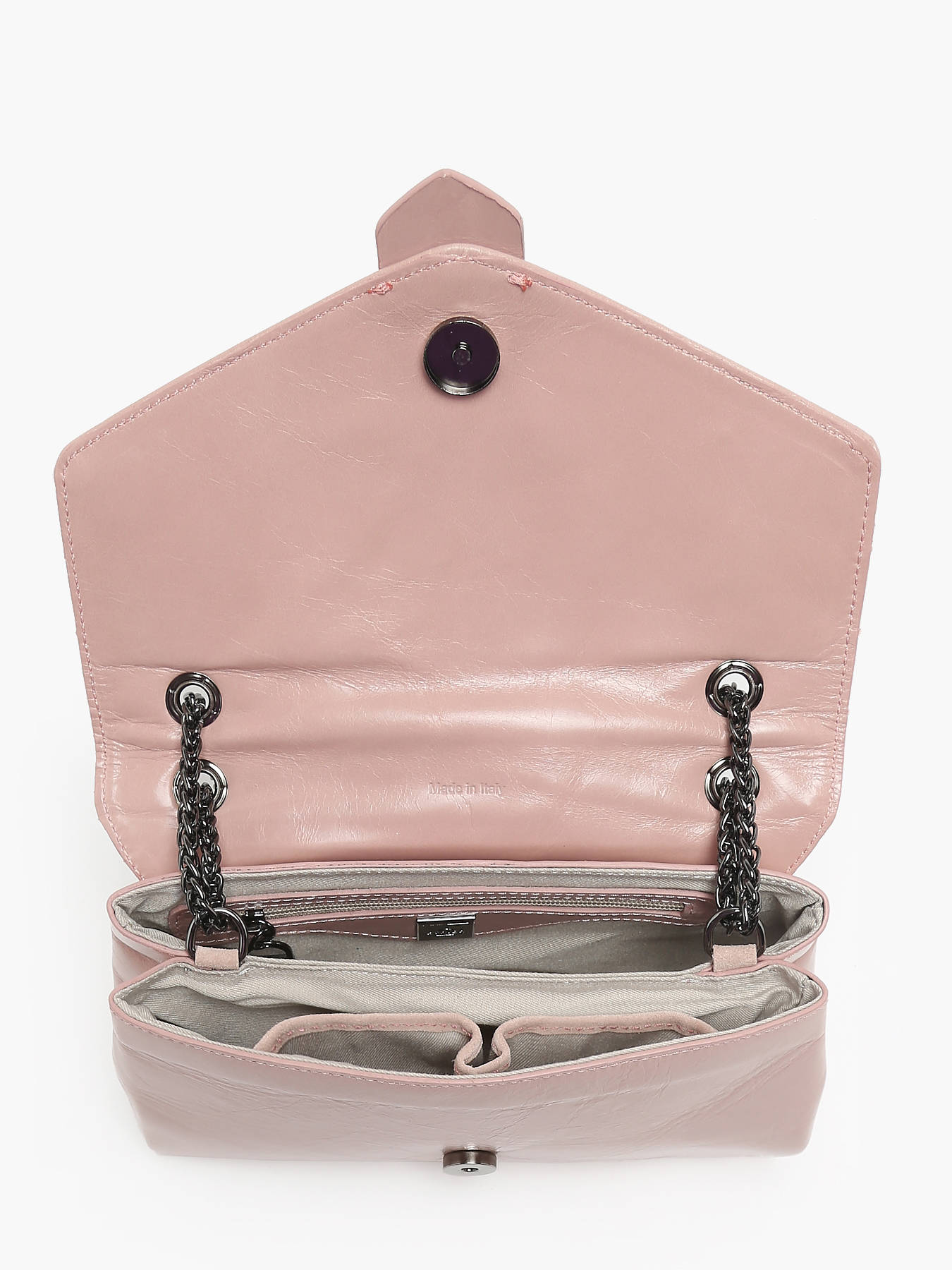 Le sac bandoulière ETRIER de la ligne JANA AMOUR est décliné dans son plus grand format. Son cuir légèrement brillant avec un effet craquelé lui confère une élégance distincte. Il est fabriqué en cuir de vachette et dispose d'une poche au dos. La fermeture se fait par rabat avec une pression aimantée. Avec une bandoulière en chaîne et cuir, il peut être porté en bandoulière ou à l'épaule. À l'intérieur, deux compartiments comprennent deux poches plaquées et une poche éclair, tous doublés en coton.